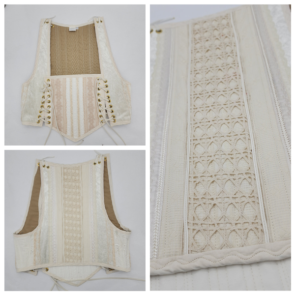 Our classic bodice style is heavily boned with a flat steel boning, providing a very sturdy support. It has a square neckline and extends to the high waistline, above the hips. They have ties at the shoulders and two ties at the side front.