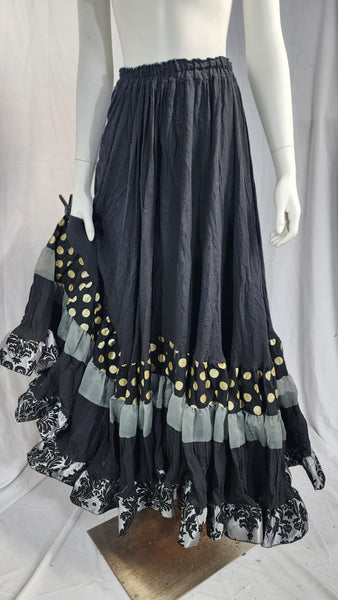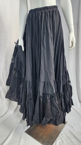 Our one-of-a-kind Liz skirts are over 25 yards of fabric when measured along the hemline, which means there’s plenty of fullness for tucks or bustles. They can be worn on their own or with an overskirt, and look lovely with any of our corsets and bodices. Check out our Getting Dressed Tutorials for fun ideas on how to wear yours!