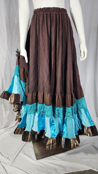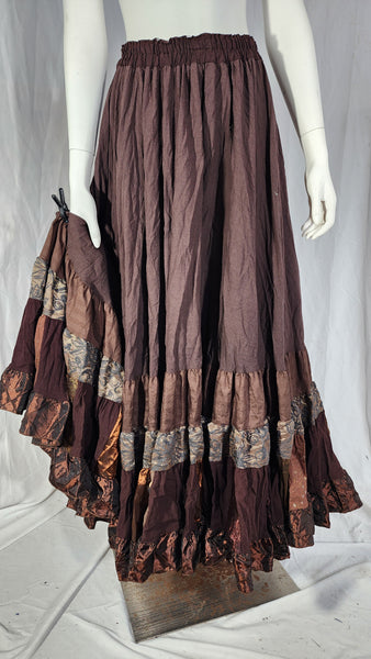 Our one-of-a-kind Liz skirts are over 25 yards of fabric when measured along the hemline, which means there’s plenty of fullness for tucks or bustles. They can be worn on their own or with an overskirt, and look lovely with any of our corsets and bodices. Check out our Getting Dressed Tutorials for fun ideas on how to wear yours!