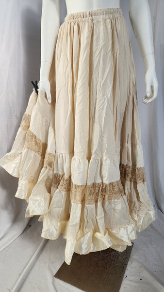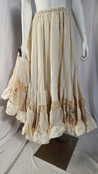 Our one-of-a-kind Liz skirts are over 25 yards of fabric when measured along the hemline, which means there’s plenty of fullness for tucks or bustles. They can be worn on their own or with an overskirt, and look lovely with any of our corsets and bodices. Check out our Getting Dressed Tutorials for fun ideas on how to wear yours!