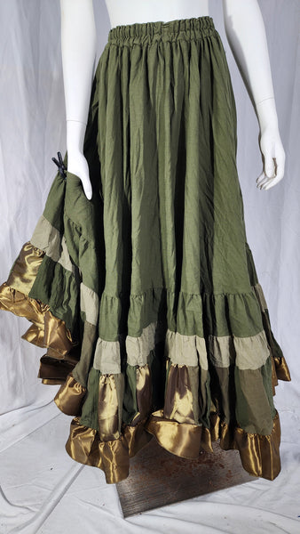 Our one-of-a-kind Liz skirts are over 25 yards of fabric when measured along the hemline, which means there’s plenty of fullness for tucks or bustles. They can be worn on their own or with an overskirt, and look lovely with any of our corsets and bodices. Check out our Getting Dressed Tutorials for fun ideas on how to wear yours!
